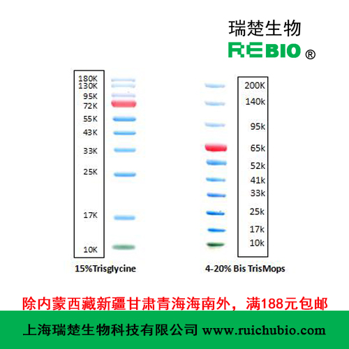 本色预染蛋白质分子量Marker包含了从10k到180k共10种高度纯化并预染的重组蛋白质(10, 17, 25, 33, 43, 55,72, 95, 130,180k,均带His标签),其中72kD条带为橙红色,10k为绿色。标示表观分子量经过thermo26610和26614非预染蛋白质分子量标准标定。适合作为SDS-PAGE和Western的蛋白质分子量标准。本彩色预染蛋白质分子量标准已经配制在1×SDS-PAGE上样缓冲液中,直接使用,不要煮沸、稀释和加入还原剂处理。根据上样孔的大小,本彩色预染蛋白质分子量标准通常每次上样5-10微升(5×1.5mm胶孔5ul足够),即可在电泳时、电泳后和转膜后观察到非常清楚的蛋白条带。